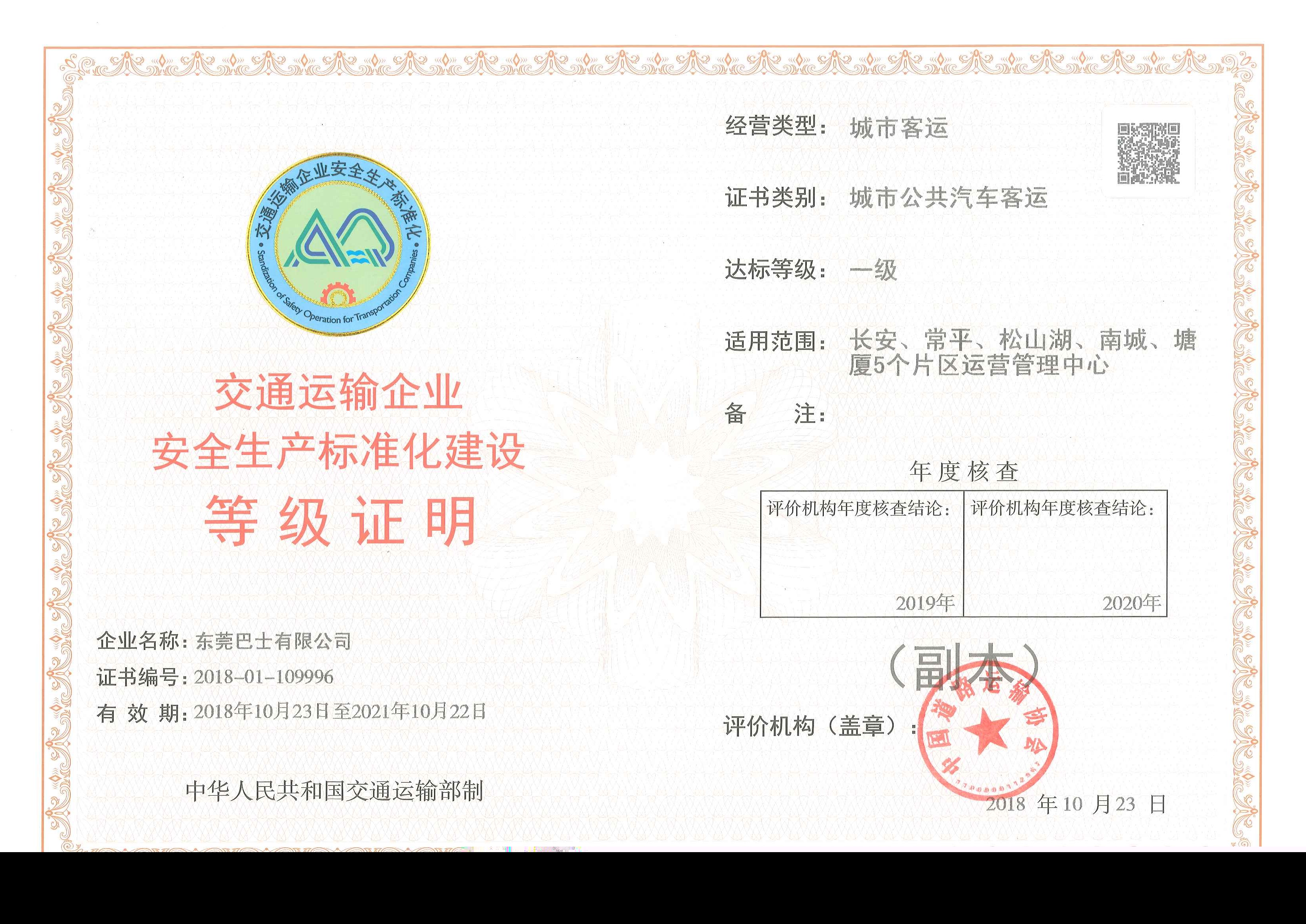 2018年10月,東莞巴士公司被中國道路運輸協(xié)會評為城市公共汽車客運安全標(biāo)準(zhǔn)化一級達標(biāo)企業(yè)。