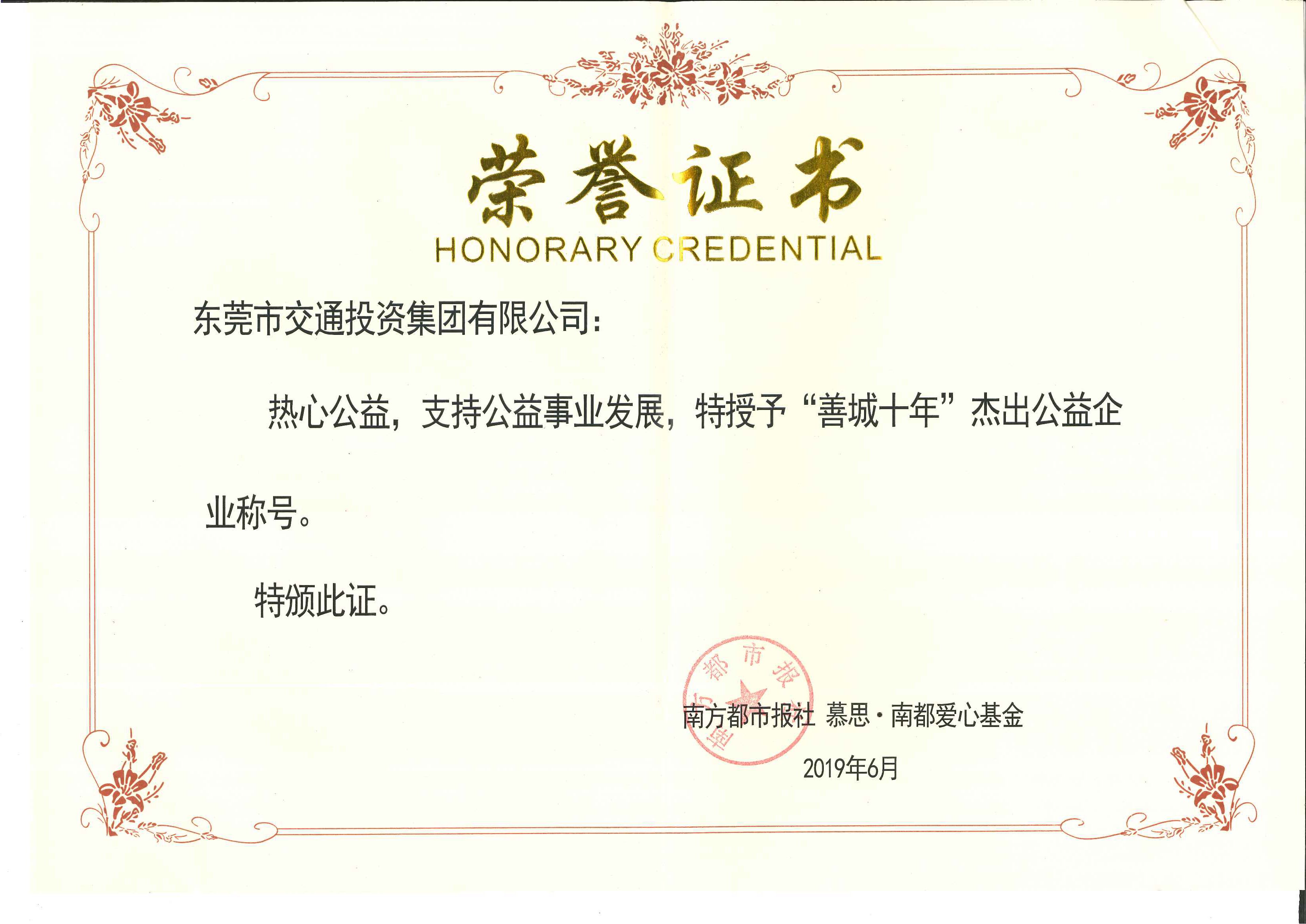 2019年6月,東莞市交通投資集團有限公司榮獲“善城十年”杰出公益企業(yè)稱號。