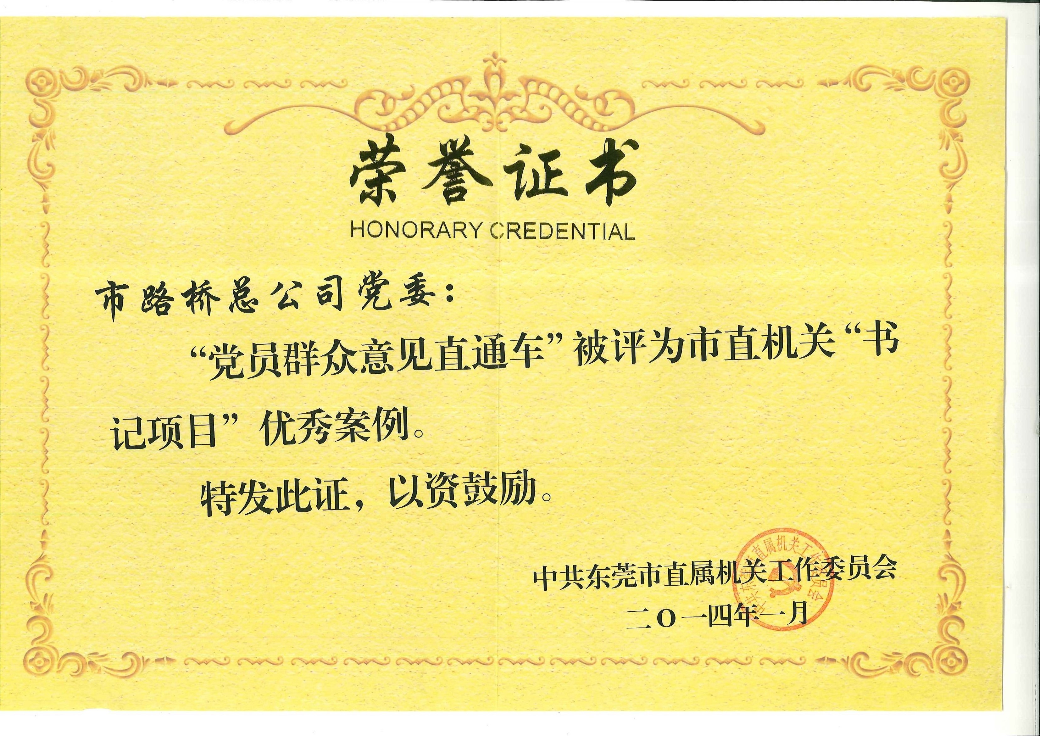 2014年1月30日,市路橋總黨委在“黨員群眾意見直通車”被評為市直機關(guān)“書記項目”優(yōu)秀案例。
