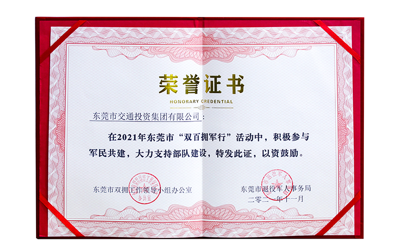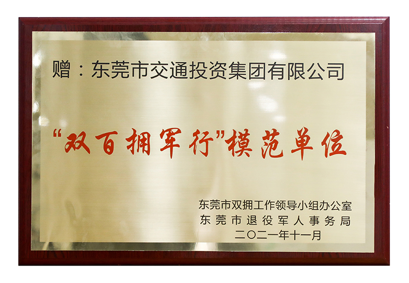 2021年11月,東莞交投集團獲“雙百擁軍行”模范單位(證書)