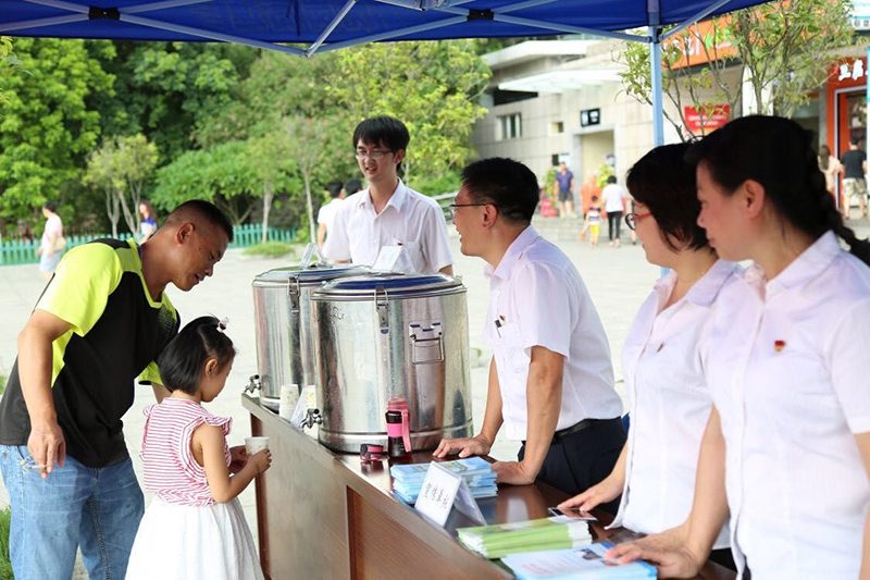 2018年7月19日,常虎分公司志愿服務(wù)主題黨日活動(dòng),為來(lái)往司乘人員提供涼茶、茶葉茶等解暑飲料。