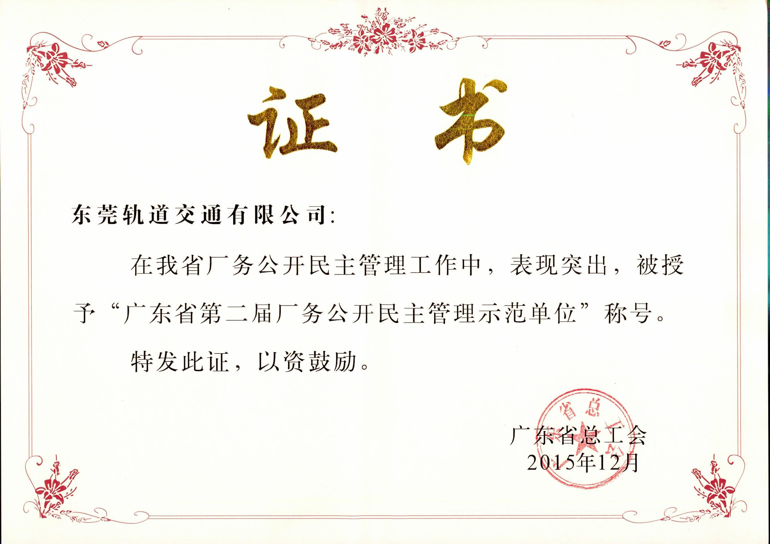 2015年,廣東省總工會(huì)授予市軌道公司“廣東省第二屆廠務(wù)公開(kāi)民主管理示范單位”榮譽(yù)稱號(hào)。