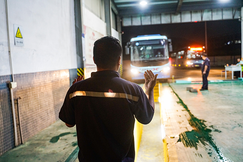 濱海灣公交公司長安涌頭停場維修車間維修師傅引導(dǎo)車輛進入檢修區(qū)域