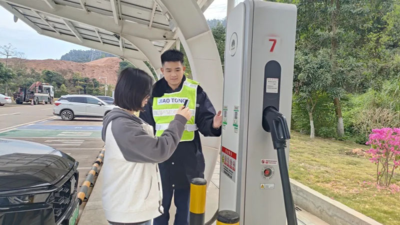 在服務(wù)區(qū),集團(tuán)高速值班工作人員加強(qiáng)巡邏,積極疏導(dǎo)指引現(xiàn)場車輛,確保有序停放車輛;同時(shí),主動(dòng)協(xié)助司乘使用充電樁,確保車主能夠順利快捷充電。此外,服務(wù)區(qū)工作人員主動(dòng)服務(wù)過往司乘,為司乘提供路線咨詢、溫開水、幫助司乘處理突發(fā)情況。