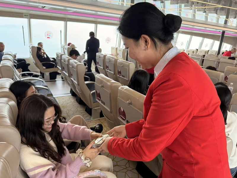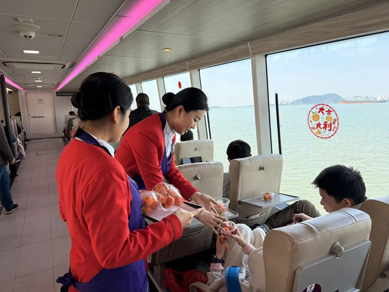 虎門港澳客運的乘務員們,同樣選擇了堅守崗位,她們身著制服,面帶微笑,穿梭在船艙之間,為旅客提供溫馨的服務,并送上節(jié)日的祝福和溫暖的問候,用實際行動詮釋了對工作的熱愛與執(zhí)著。對她們而言,春節(jié)不僅僅是一個節(jié)日,也是一份沉甸甸的使命。