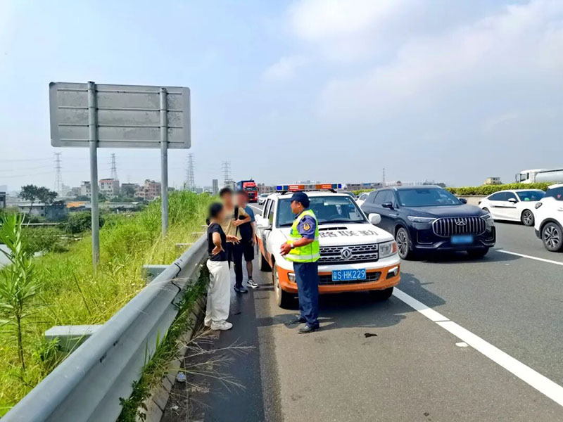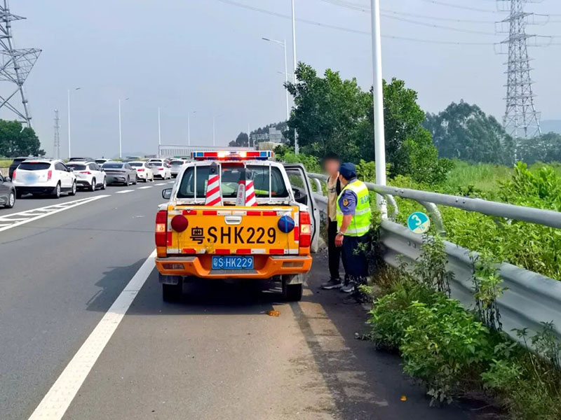 國慶假期莞番高速東行路段車流密集,路政員賴建輝駕駛巡邏車,和副駕駛張志威在執(zhí)行日常巡邏任務(wù)。二人突然發(fā)現(xiàn)右側(cè)應(yīng)急車道護欄邊,一名背著書包的少年正在高速公路應(yīng)急車道邊緣行走,情形十分危險。