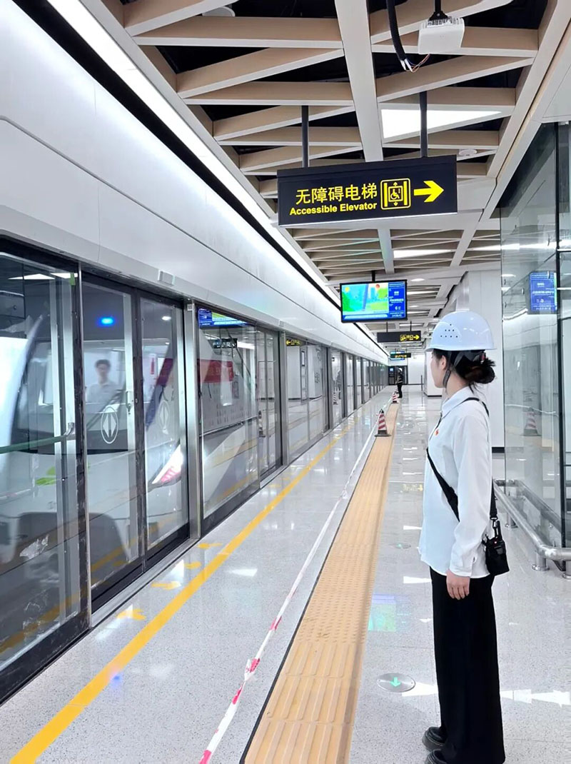 雙節(jié)期間,站務(wù)人員在站臺指定位置,投入列車試運行接發(fā)工作,提前確認進路信號與站臺安全,緊盯車門與屏蔽門對位,確保列車平穩(wěn)???、安全出站??蛰d試運行階段的車站雖無熙攘的客流,但有工作人員堅守的溫度。
