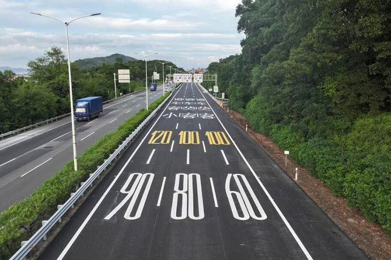 標線工藝也進行了創(chuàng)新,首次采用"熱熔車道邊緣線+雙組份車道分界線"組合工藝,提升標線耐久性。雙組份標線采用A、B兩種獨立組分在施工時按比例混合后,通過化學反應噴涂固化形成不可逆的高分子網(wǎng)狀結構,提升耐久性和反光性能,延長使用壽命可達3-5年甚至更長。