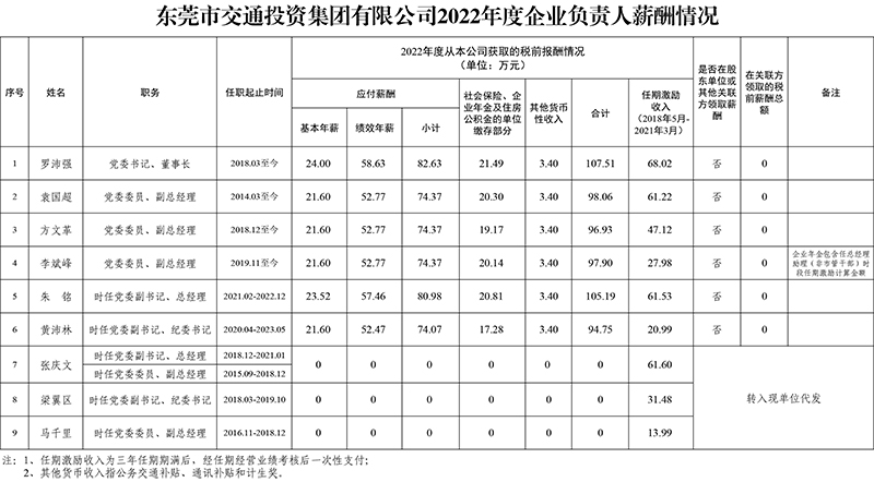 東莞市交通投資集團(tuán)有限公司2022年度企業(yè)負(fù)責(zé)人薪酬情況